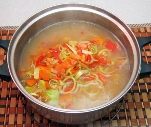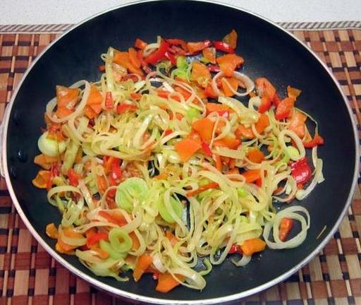 Then add the leek and bell pepper to the carrot. Sauté for 3-5 minutes, until the onion and pepper are soft and lightly browned.