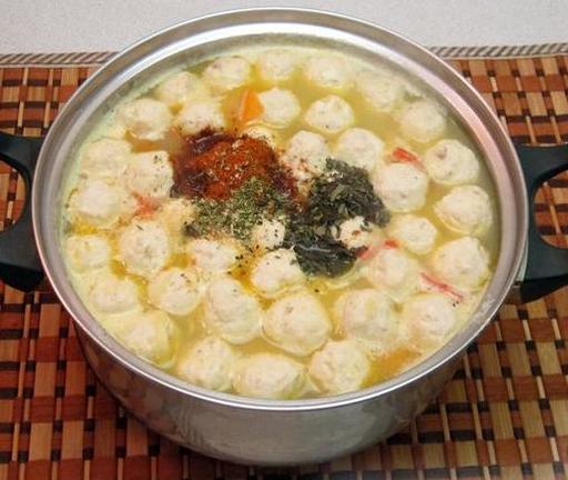 Simmer the soup with meatballs over low heat for 5 minutes. Then add garlic powder, paprika, khmeli-suneli, and basil.
