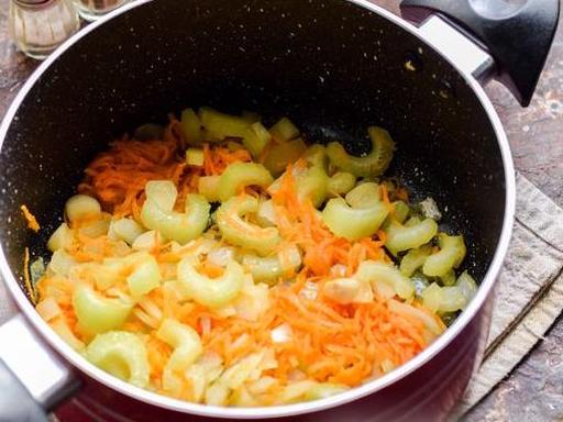 Dice the onion finely. Grate the carrot on a fine grater. Cut the celery into pieces. Slice the garlic.