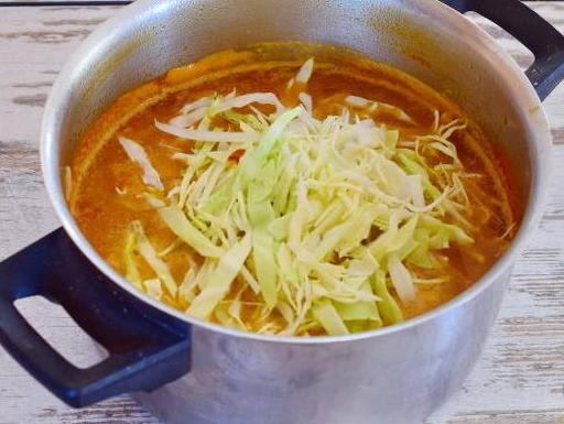 At the very end, add the shredded cabbage and cook the soup for another 10 minutes. Remove the finished cabbage soup from the heat, add black ground pepper.