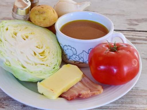 Prepare all ingredients for the Irish cabbage and bacon soup. Instead of canned tomatoes in their own juice, you can use fresh tomatoes.