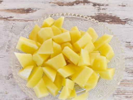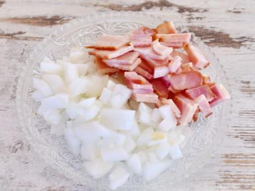 Peel the onion and cut it into small cubes. Cut the bacon into small strips.