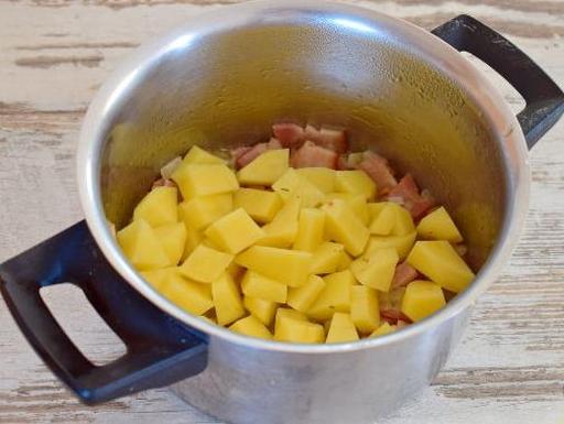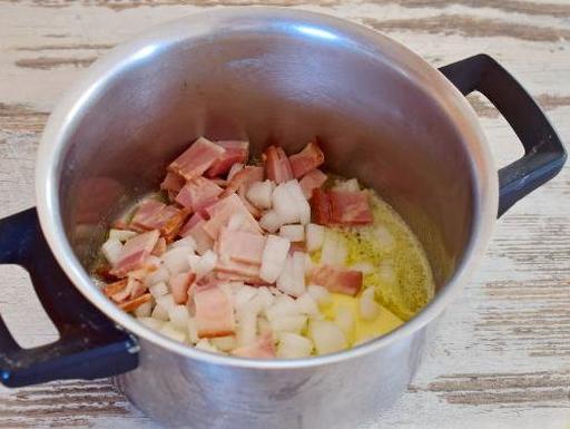 Add onion and bacon to the pot and fry for 3-5 minutes.