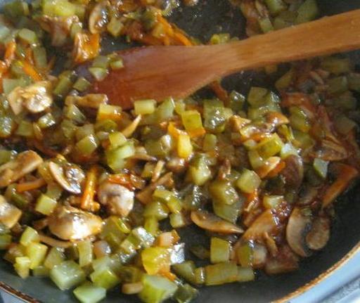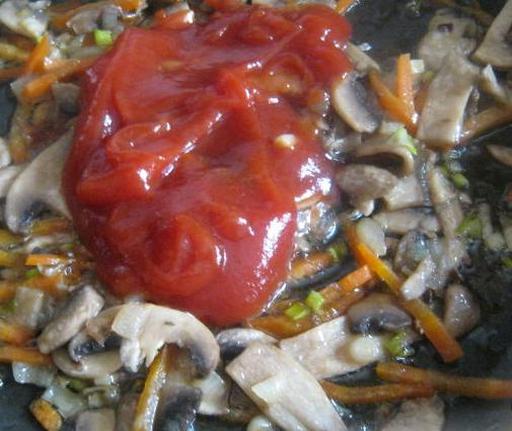 Then add the mushrooms, sauté everything together for 3-5 minutes, stirring. After that, add tomato paste and mix.