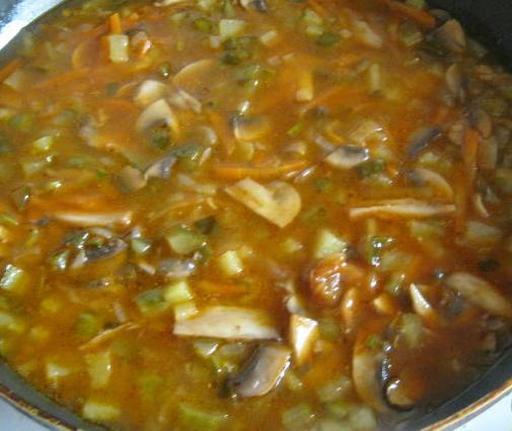 Then pour 0.3 cups of vegetable broth from the pot into the frying pan. Simmer for 5 minutes.