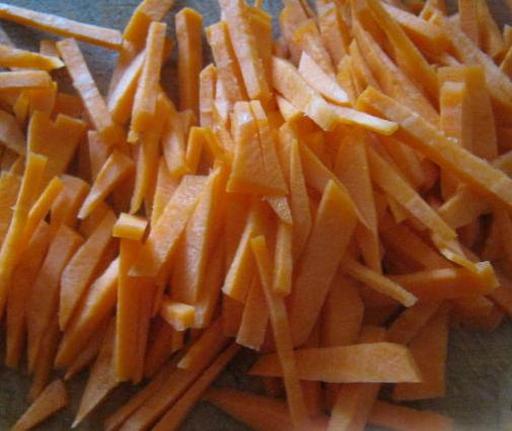 How to prepare Lenten rassolnik with mushrooms: Peel, wash, and cut the carrots into thin strips or grate them on a coarse grater.