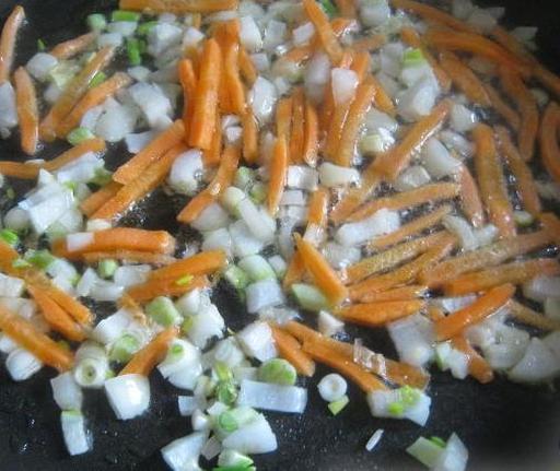 Heat a frying pan and add vegetable oil. Sauté the remaining onion and carrots in the hot oil. Sauté over medium heat, stirring, for 2-3 minutes.