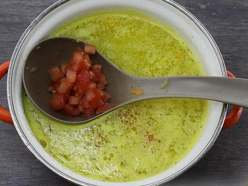 Dice the tomato finely and add it to the soup. Bring to a boil and cook for 5-7 minutes over low heat.