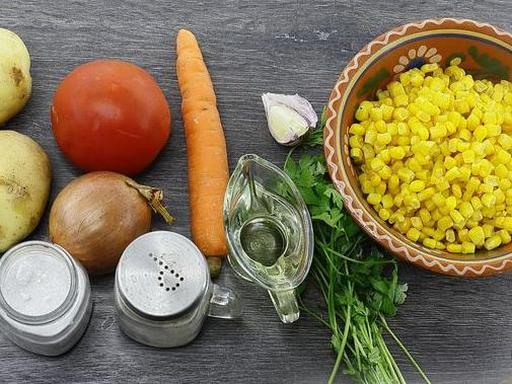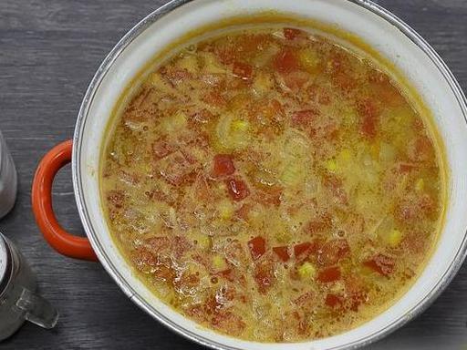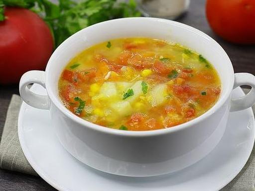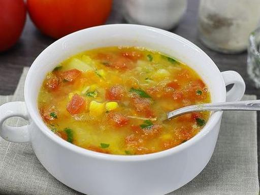 A delicious, vibrant, and aromatic pottage with corn and tomatoes. This soup is prepared with water, eliminating the need for pre-boiling broth, which saves time. The pottage has a medium consistency, boasting a rich corn flavor and a distinct vegetable aroma.