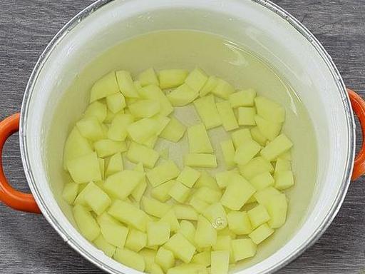 Peel and dice the potatoes. Place the potatoes in a pot, cover with cold water, and bring to a boil. Cook for 7-8 minutes over low heat.