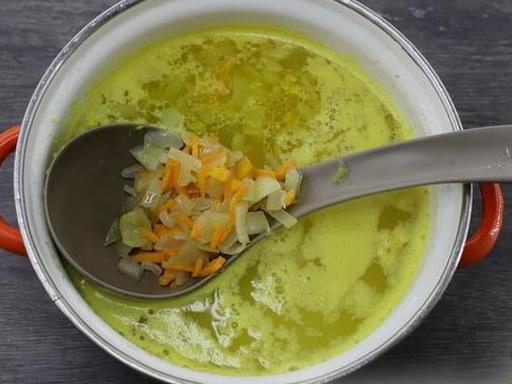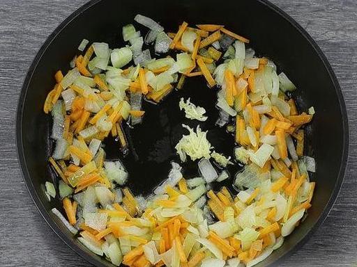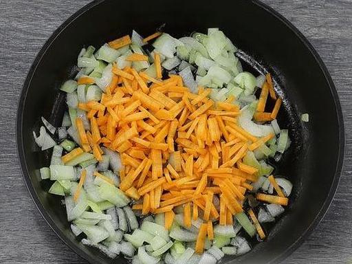 Peel the carrots and cut them into thin strips. Add the carrots to the onion, mix well. Cook over low heat for 5-7 minutes, stirring.