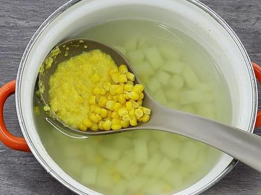 Add the pureed corn and whole corn kernels to the pot with potatoes. Bring to a boil and cook for approximately 8-10 minutes.