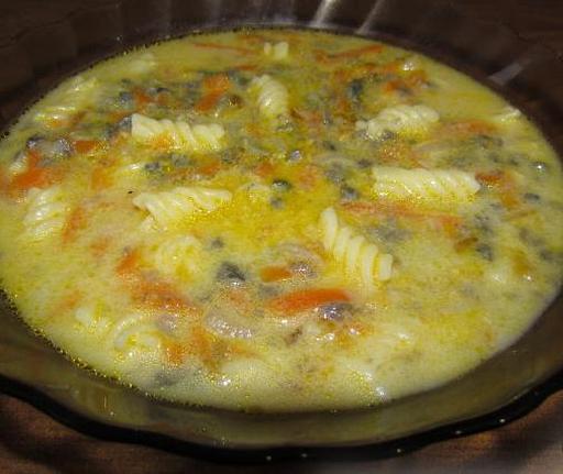 5 minutes after boiling, add 2 tbsp of processed cheese, mix thoroughly. Cook the mushroom soup for another 5 minutes.