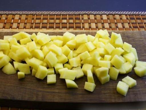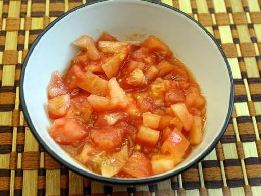 Blanch the tomatoes in boiling water for 1 minute, then peel them. Dice the tomatoes into small cubes.