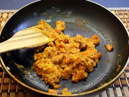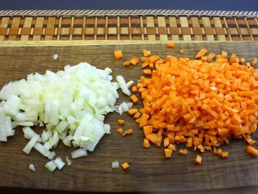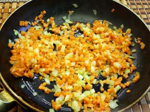 In a frying pan, heat 1 tablespoon of vegetable oil and sauté the onion and carrot for about 5 minutes, until soft and lightly golden.