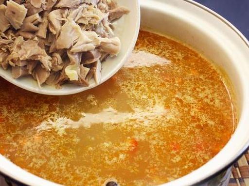 Next, add the chicken meat. Cook the soup for another 3-4 minutes.