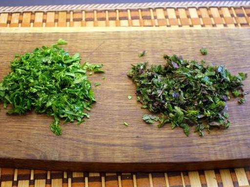 Wash the mint and parsley, shake off excess water, remove tough stems, and finely chop the leaves. A small amount of mint and parsley can be reserved for garnish.