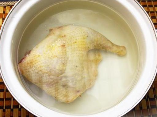 Place the chicken thigh in a pot, cover with 1.8-2 liters of water, and bring to a boil. Carefully skim off any foam as it boils.