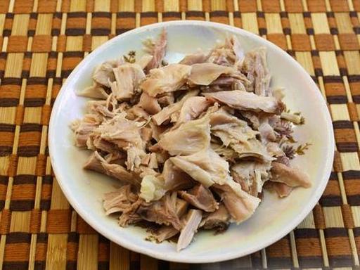 After this, remove the cooked chicken from the broth. Separate the chicken meat from the bone, cut into small pieces, cover, and set aside.