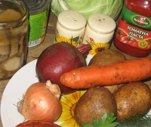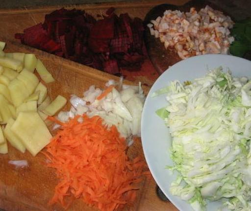 Cut carrots, beets, and cabbage into fine strips. Finely chop the bacon. Cut potatoes into sticks. Drain the mushrooms and separately strain the marinade through a sieve.