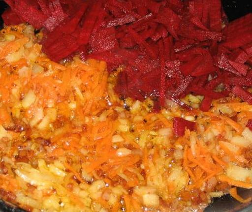 In a frying pan, render the bacon, then fry onion and carrot in the rendered fat, add beets. Fry the beets for 3-4 minutes, then pour in mushroom marinade (150 ml), reduce heat, and simmer with a lid for 10 minutes. Add tomato paste and simmer for another 5 minutes.