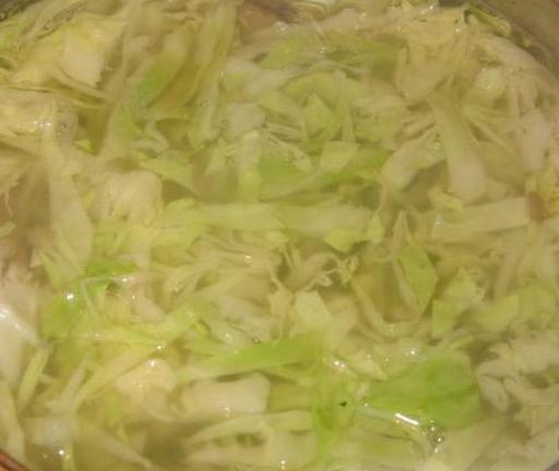 Add mushrooms to the cooked broth. Let them simmer for 5 minutes, then add potatoes. After 10 minutes, add cabbage and cook for 3 minutes.