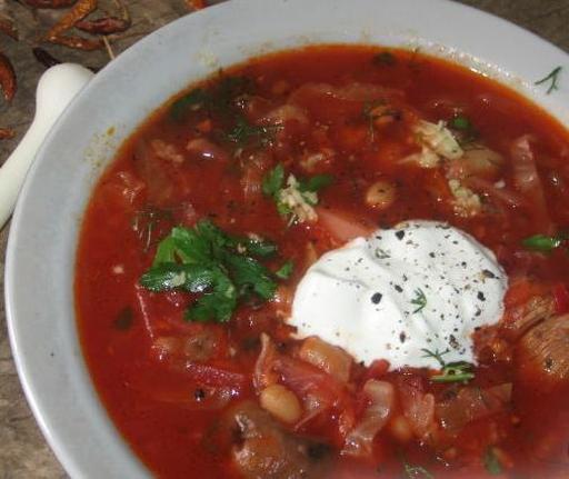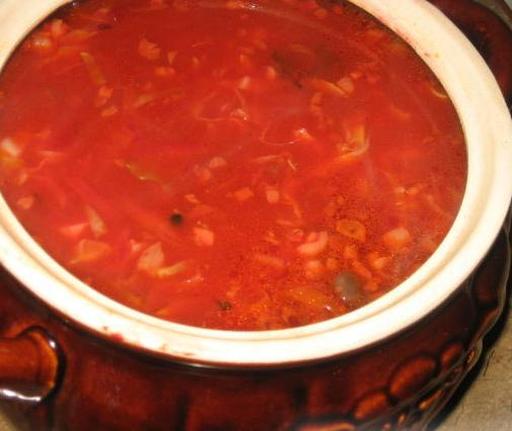 Now, pour the contents of the pot into a ceramic pot, add the stewed vegetables and beans, season with salt to taste, and cover with a lid. Place the pot in an oven preheated to 100-120 degrees Celsius and braise the borscht for 1 hour.