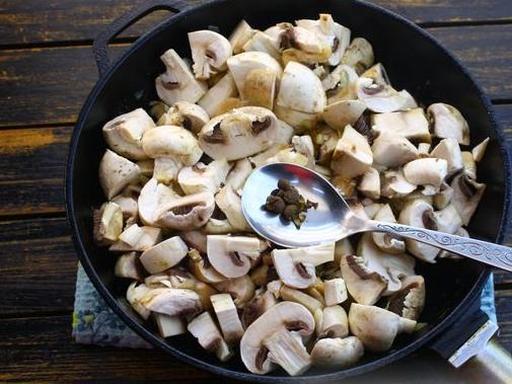 Расплющите горошины душистого перца (например, рукояткой ножа) и добавьте в сковороду.