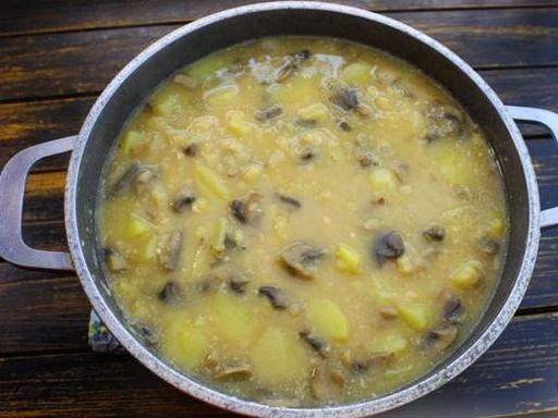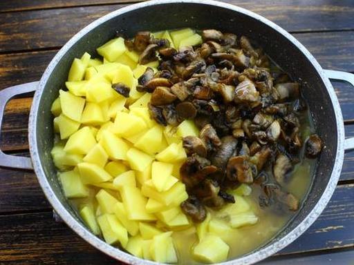 Добавьте картофель и обжаренные грибы в кастрюлю (немного обжаренных грибов отложите для подачи).