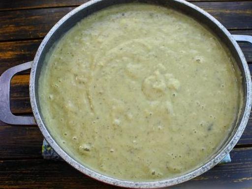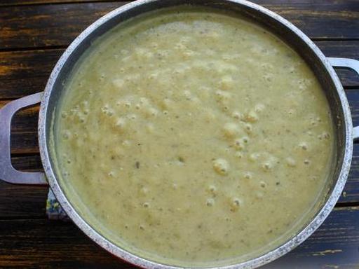 Снимите кастрюлю с огня и измельчите содержимое в пюре при помощи погружного блендера.