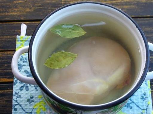 Примерно через 1 час после начала замачивания гороха поместите курицу в кастрюлю, залейте 1,4 л воды и добавьте лавровый лист.