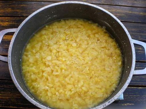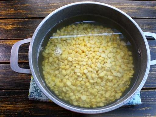 В кастрюлю с толстым дном налейте 1,3-1,4 л процеженного куриного бульона. Добавьте промытый горох.