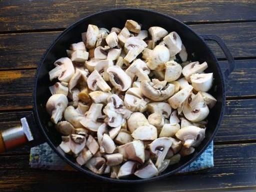 Промойте, обсушите и нарежьте шампиньоны ломтиками. Добавьте грибы в сковороду к луку.