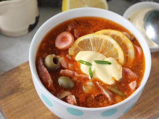 Подавайте мясную сборную солянку с колбасой, добавив в тарелку пару ломтиков лимона, оливки и сметану. По желанию можно добавить мелко нарезанную зелень. Приятного аппетита!