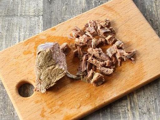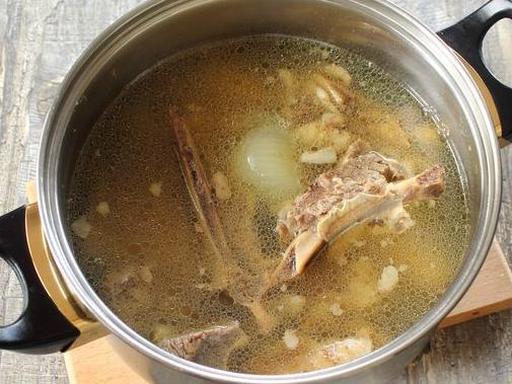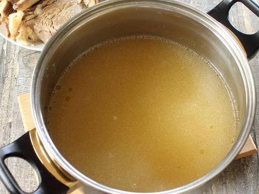 Извлеките готовое мясо из бульона и оставьте остывать. Луковица и лавровый лист больше не понадобятся. Бульон процедите и снова доведите до кипения. После длительного варки объем готового бульона составит около 1,5 л.