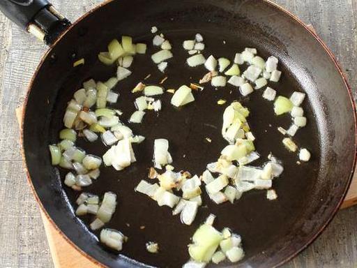 Очистите репчатый лук и мелко нарежьте. Разогрейте растительное масло на сковороде, обжаривайте лук пару минут на небольшом огне.