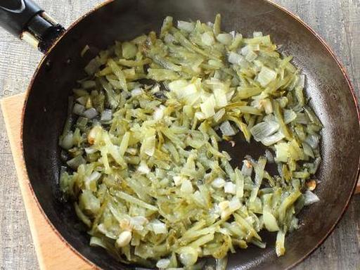 Пока лук обжаривается, натрите соленые огурцы на крупной терке. Выложите их к луку, накройте сковороду крышкой. Дайте огурцам пропариться на сковороде 5 минут.
