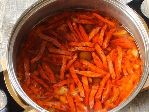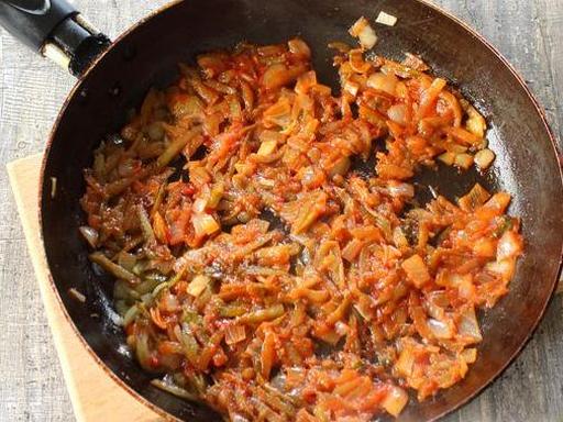 Добавьте томатную пасту и обжаривайте 3-4 минуты. Переложите зажарку в бульон. Варите в течение 10 минут.