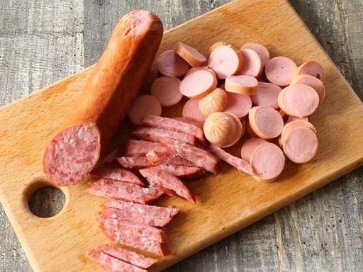 Тем временем подготовьте мясные продукты: очистите колбасу и сосиски от оболочки. Сосиски нарежьте кружочками, колбасу – соломкой.