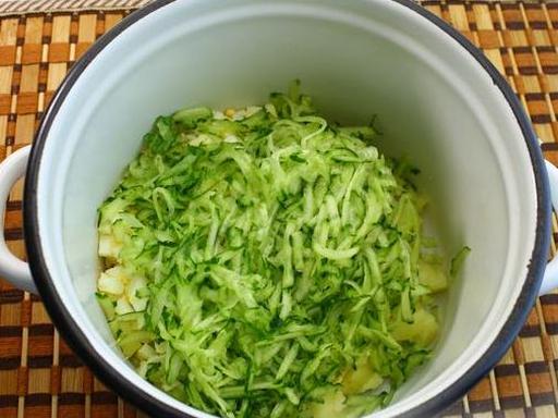 Огурцы натрите на крупной тёрке и добавьте в кастрюлю.