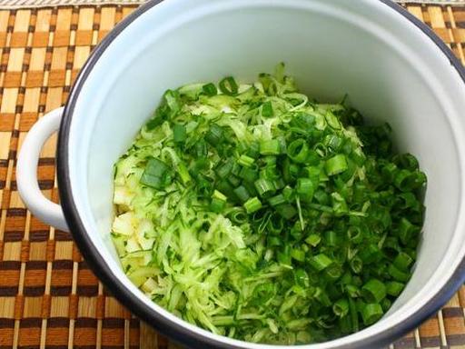 Мелко нашинкуйте зелёный лук и добавьте к остальным компонентам. Немного лука можно оставить для украшения готового блюда.