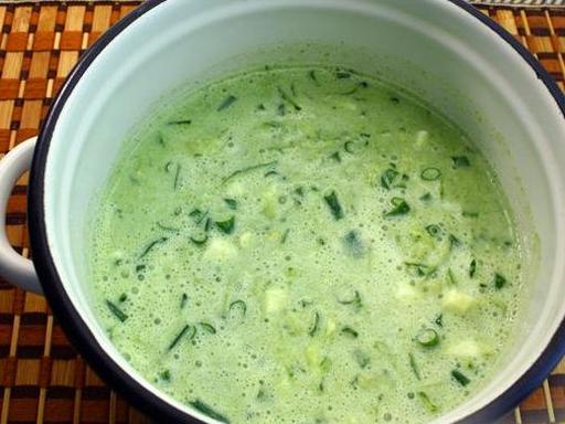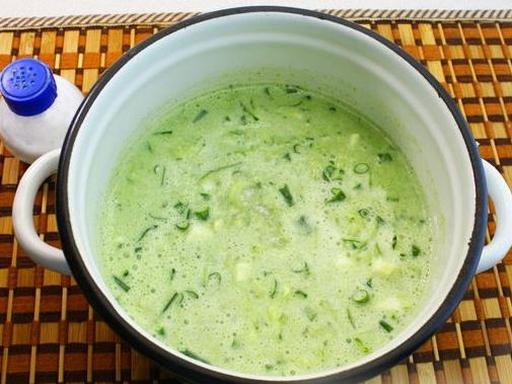 Залейте все ингредиенты "зелёным" кефиром, добавьте соль по вкусу.