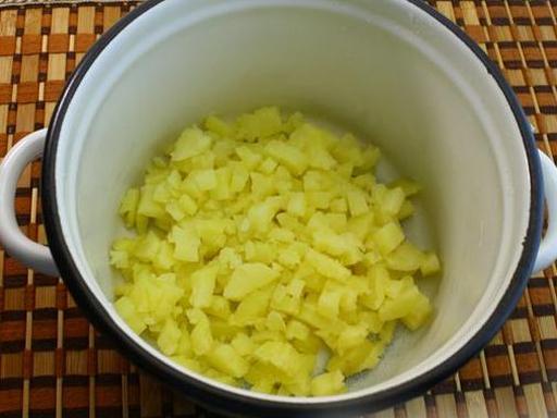 Очистите картофель, нарежьте кубиками и выложите в кастрюлю.