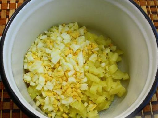 Очистите яйца, нарежьте кубиками и добавьте в кастрюлю к картофелю.