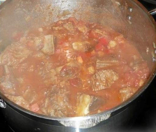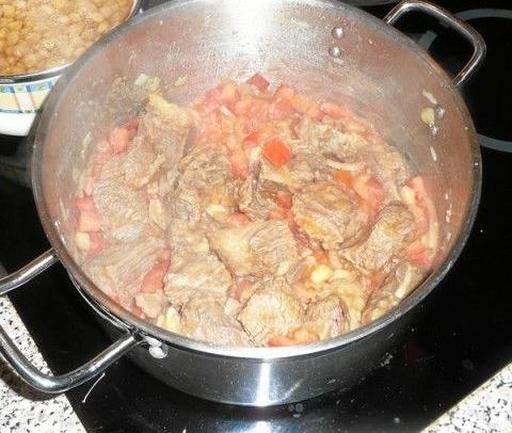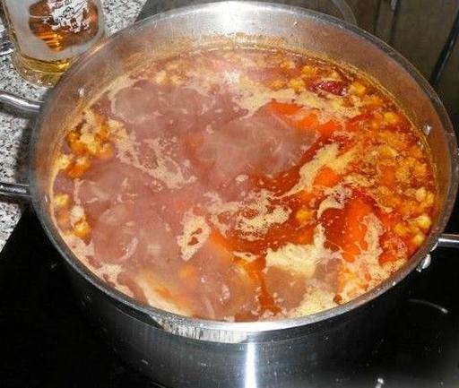 Потім влийте в каструлю 3-4 літри окропу і закладіть горох нут. Посоліть за смаком. Додайте спеції — перець та зіру. Варіть протягом 3-4 годин, щоб м'ясо добре відходило від кісток.