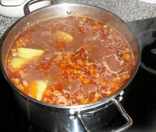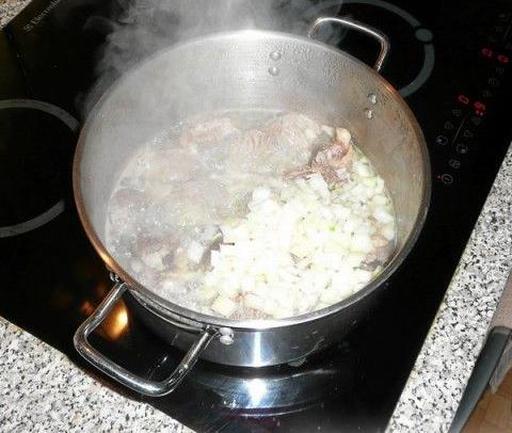 Коли м'ясо закипить, зніміть піну, що утворилася, і додайте цибулю. Варіть на сильному вогні без кришки.