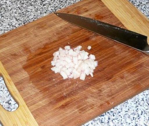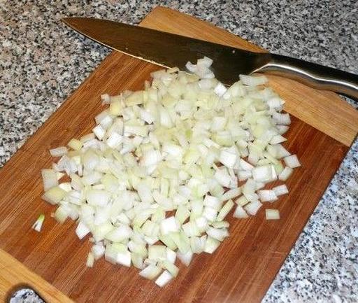 Поки м'ясо закипає, наріжте цибулю кубиками.