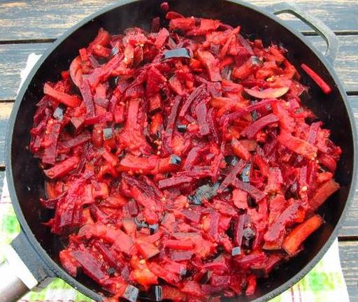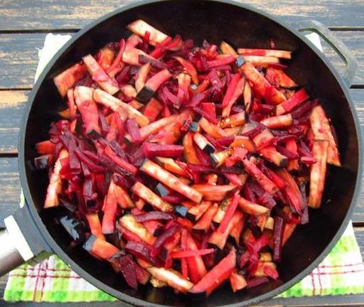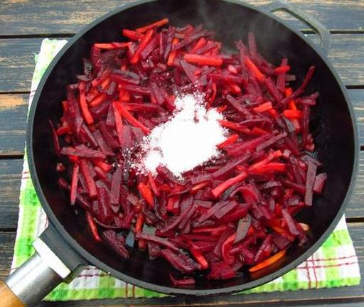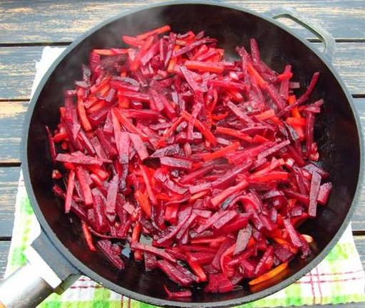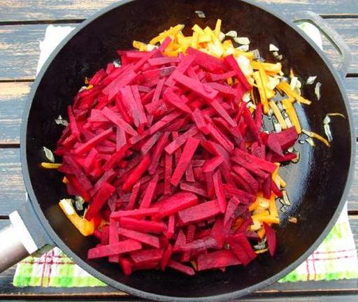Очистіть буряк, наріжте соломкою та додайте в сковороду.