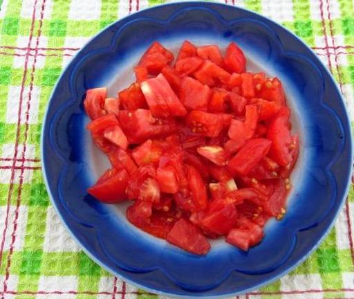 Помідори опустіть в окріп на 1-2 хвилини, очистіть від шкірки та наріжте кубиками.