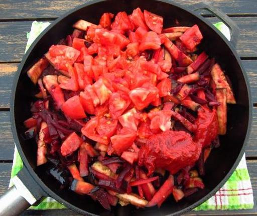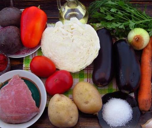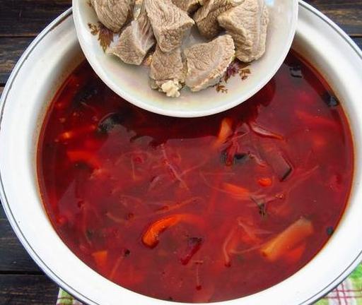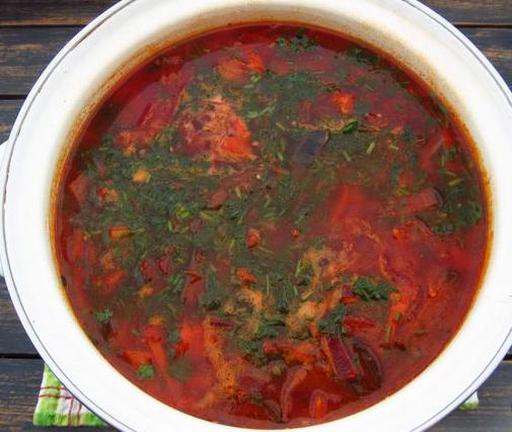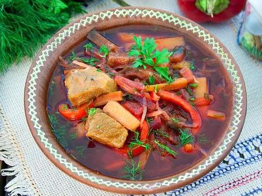 Червоний борщ на яловичому бульйоні, густий та дуже ароматний. Баклажани, а також помідори та солодкий перець чудово доповнюють борщ, роблячи його смак багатшим та насиченішим.
